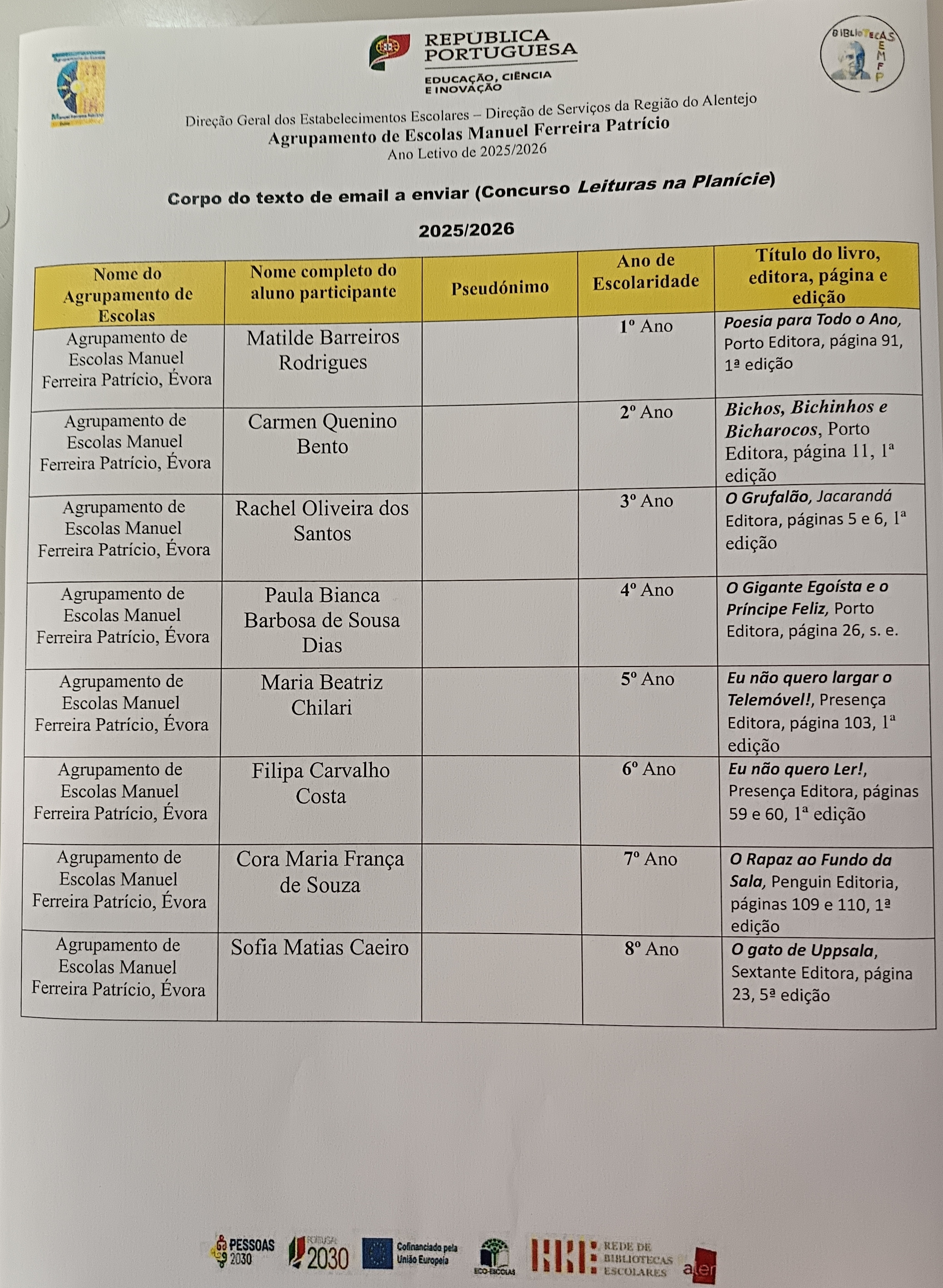 PARABÉNS, PARABÉNS, PARABÉNS a todos os nossos alunos leitores participantes neste concurso.