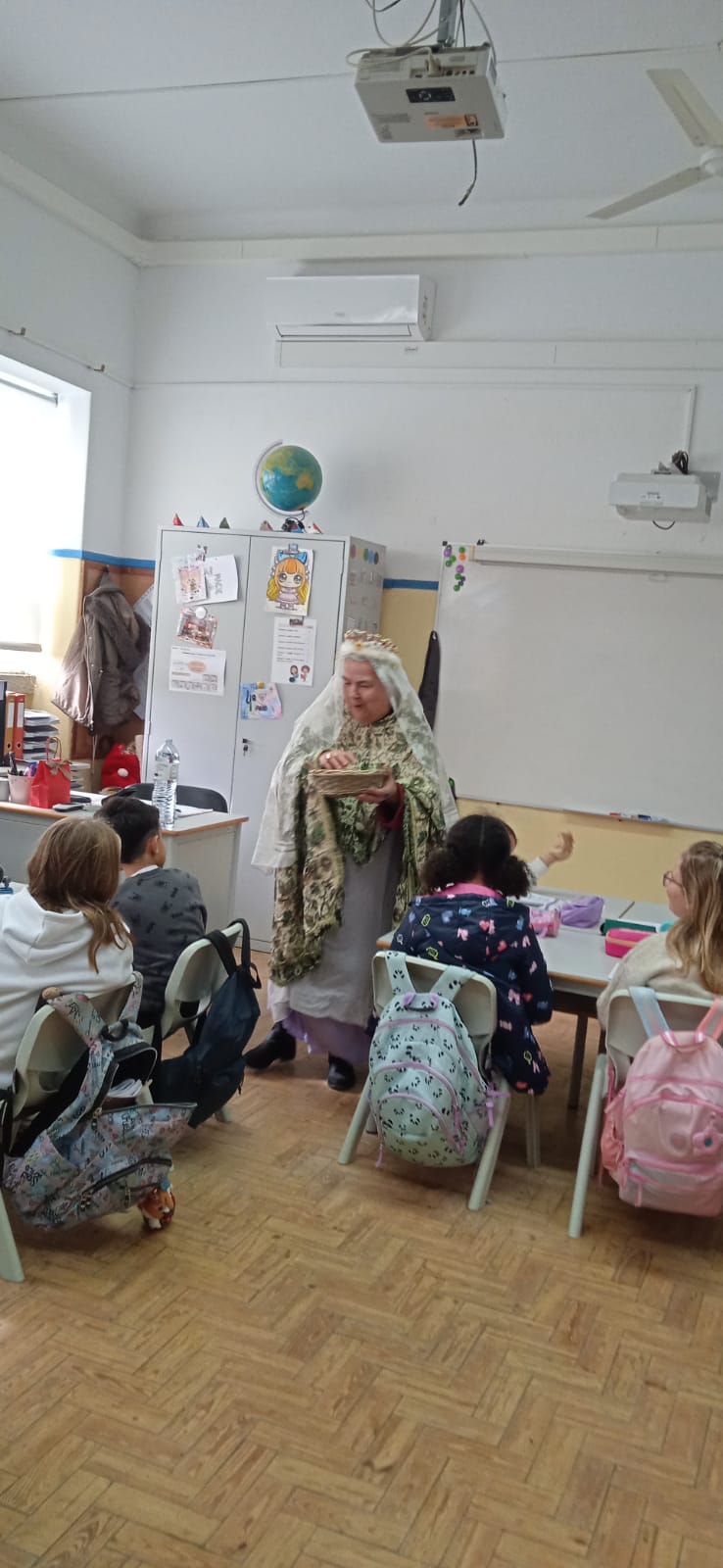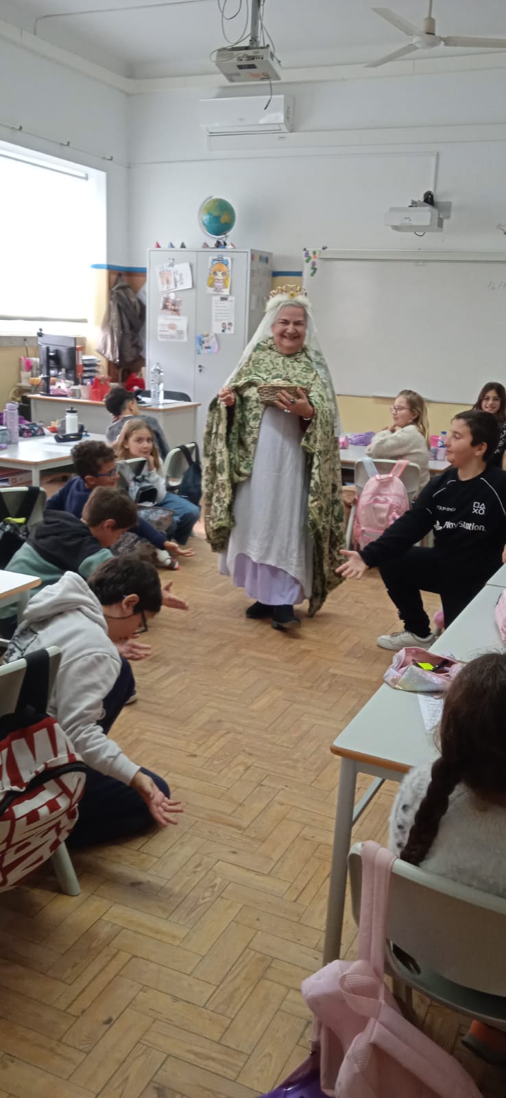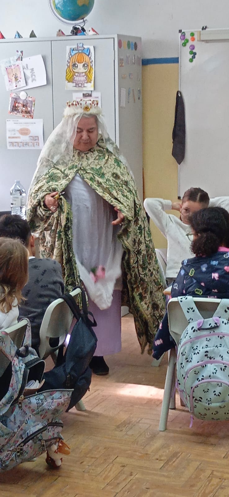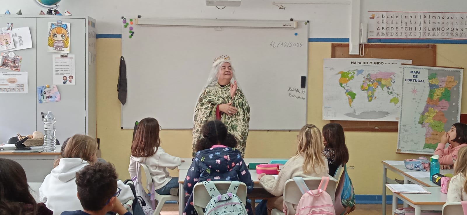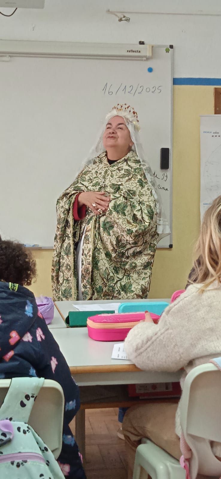 A professora Maria José Oliveira brindou a turma com uma apresentação envolvente e cheia de significado, ao interpretar a Rainha Santa Isabel, dando vida à conhecida história do Milagre das Rosas.